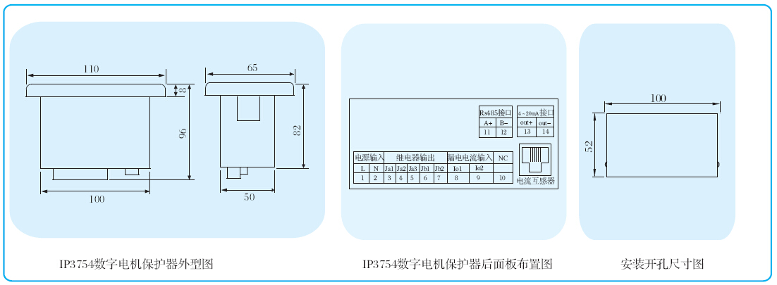 IP3754數(shù)字電機(jī)保護(hù)器(以下簡稱保護(hù)器)主要用于保護(hù)交流電壓220V,頻率50Hz,電流1000A以下的各種交流電機(jī)。具有過載、堵轉(zhuǎn)、輕載、不平衡/缺相、過壓/欠壓、短路、接地等故障保護(hù)功能,并有最大允許分?jǐn)嚯娏鞅Wo(hù)以及參數(shù)測量、操作控制、遠(yuǎn)程通訊等功能。其采用互感器與主體分離的電流輸入方式,需配合專用或通用CT模塊一起使用。
